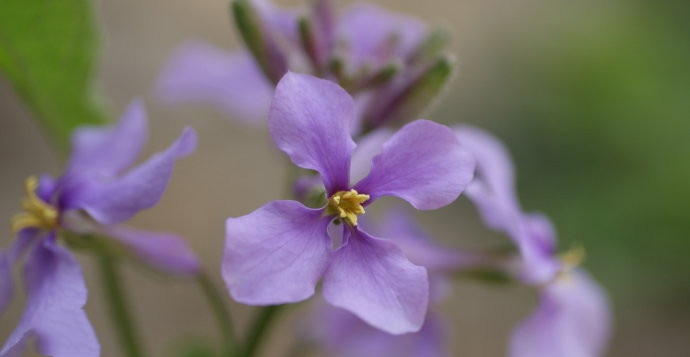 二月兰是十字花科,诸葛菜属一年或二年生草本植物,高可达50厘米,无毛;茎直立,基生叶及下部茎生叶大头羽状全裂,顶裂片近圆形或短卵形,侧裂片卵形或三角状卵形,叶柄疏生细柔毛;花紫色、浅红色或褪成白色,花萼筒状,紫色,花瓣宽倒卵形,密生细脉纹,长角果线形,种子卵形至长圆形,黑棕色,4-5月开花,5-6月结果。